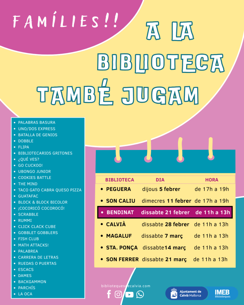 Activitats de Biblioteques de Calvià subvencionades pel Consell de Mallorca en el marc de la convocatòria de subvencions 2025 pel desenvolupament d’activitats culturals de les entitats locals de Mallorca. Les activitats dutes a terme estan incloses en els següents projectes: Dia del Llibre 2025, Teatre a les biblioteques, Folklore i Tradicions a les biblioteques i Autors al Club de Lectura.